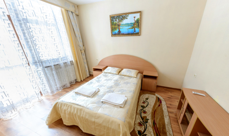 В номере: мини-холодильник, одна полуторная кровать, стол, стул, телевизор, тумбочка, электрочайник, набор посуды, зеркало, вешалка